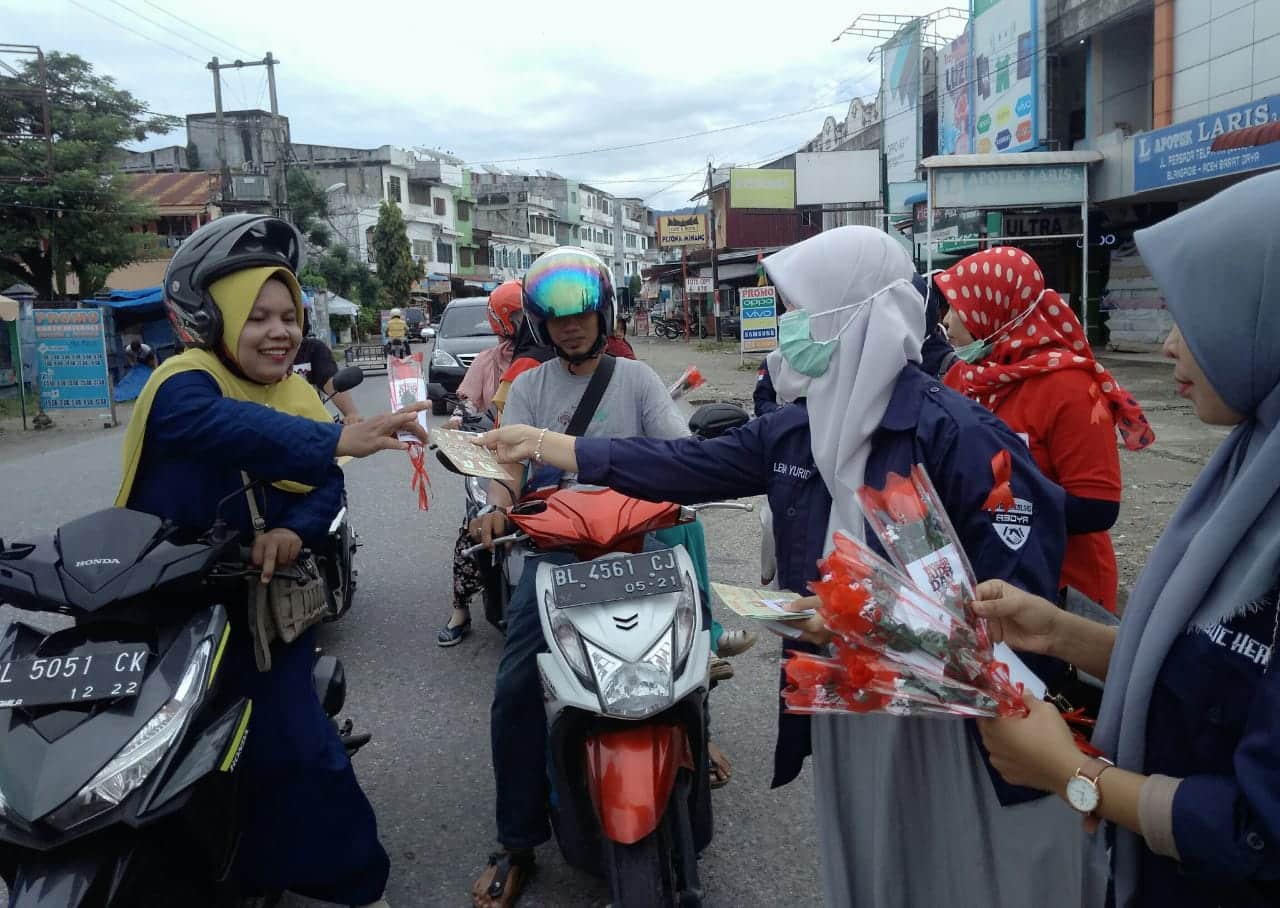 Pantauan Kanalaceh saat di lokasi Liflet dan bunga mawar merah, dibagikan juga kepada para pengendara truk, becak motor maupun pengendara mobil dan motor yang melintas. [Jimi Pratama]