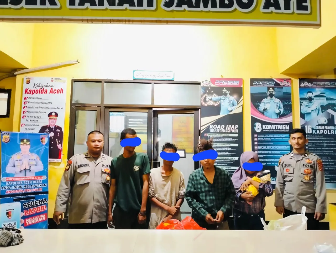 Mereka yang diamankan yakni Fajar Maulana (20), Rian Prayuda (18) keduanya merupakan pemuda asal Sigli, kemudian Ari (28) asal Aceh Selatan dan Istrinya Dinda (26) asal Medan yang menggendong bayi berumur satu bulan.