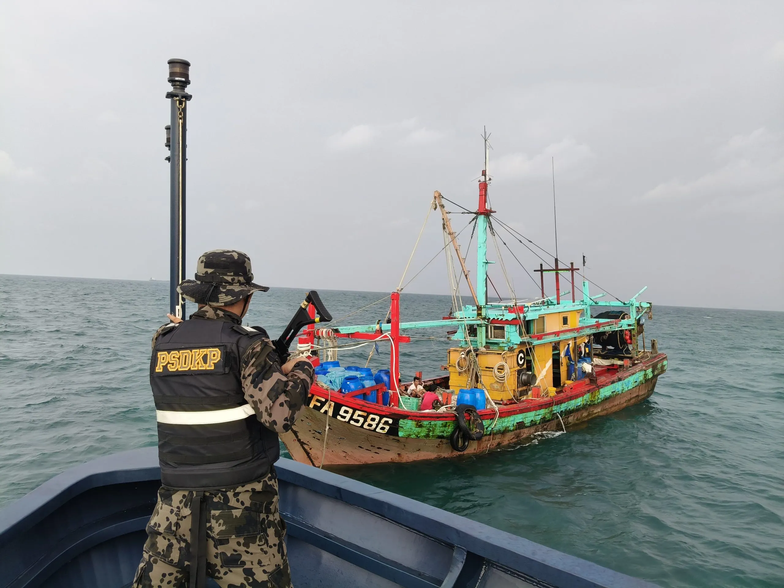 Hasil pemeriksaan tim Kapal Pengawas (KP) Barakuda 01 terhadap kapal PKFA 9586, selain tidak memiliki izin dari Pemerintah Indonesia juga tidak memasang atau mengibarkan bendera apapun di atas kapal. Kapal ini juga diawaki lima orang berkewarganegaraan Myanmar.
