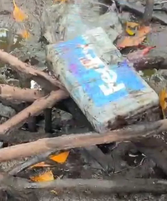 Saat itu, saksi E R melihat sebuah bungkusan plastik bening tersangkut di akar pohon dalam kondisi berlumpur.