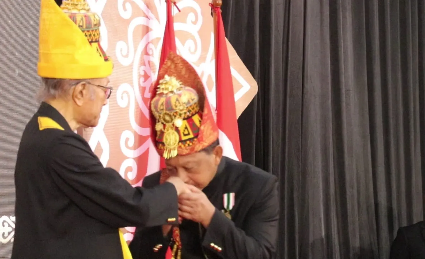 Saat poses pemberian gelar itu tampak Tito menggunakan pakaian adat Aceh lengkap dengan rencong dan simbol penghormatan terhadap adat dan budaya Aceh yang melekat di dadanya.