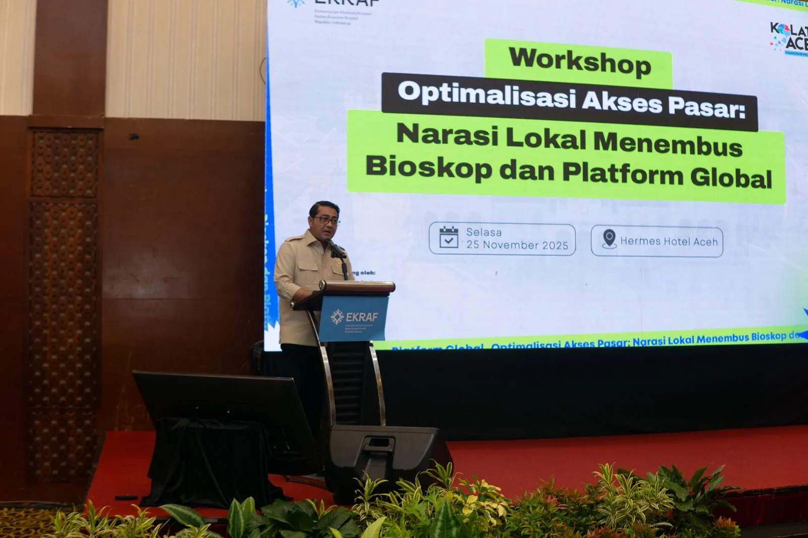 Selain pemutaran, Kementerian Ekonomi Kreatif menggelar Workshop Film bertajuk “Optimalisasi Akses Pasar – Narasi Lokal Menembus Bioskop dan Platform Global” di Hermes Palace Hotel Banda Aceh.
